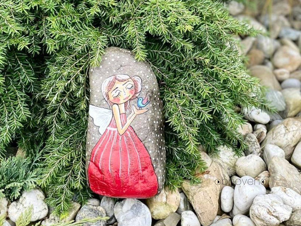 Ručně malovaný kámen akrylovými barvami. Povrchová úprava provedena bezbarvým akrylovým lakem. Dekorativní předmět vhodný na zahradu i do interiéru.